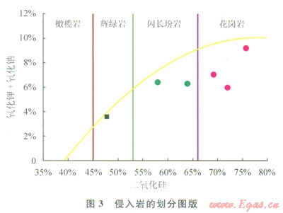 儲層巖性識別是油氣藏評價的前提和基礎工作,與常見的沉積巖不同的是基巖巖性復雜多變,測井識別困難。地面露頭踏勘和鉆井巖心分析表明東坪氣田的基巖包括火成巖和變質巖兩大類巖性(圖1),北部3井區(qū)基巖以侵入巖為主,南部1井區(qū)以變質巖為主。研究表明侵入巖主要為花崗巖,中間夾有輝綠巖、閃長玢巖的巖脈。變質巖可分為3大類,分別為花崗片麻巖、斜長片麻巖和鈣質片麻巖。侵入巖和變質巖的區(qū)分可利用鉀和自然伽馬的交會圖(圖2)。由于侵入巖以鉀長石含量較高的花崗巖為主,其鉀含量和自然伽馬為相對高值,變質巖的鉀和自然伽馬相對低值。因此侵入巖位于交會圖的右上角而變質巖位于交會圖的左下方。利用元素俘獲譜資料實現(xiàn)兩大類巖性的細分。二氧化硅與氧化鈉和氧化鉀之和的交會圖(圖3)實現(xiàn)侵入巖的細分,花崗巖的二氧化硅含量高,為66%,輝綠巖為45%~53%,閃長玢巖為53%~66%。據此實現(xiàn)了北部3井區(qū)基巖儲層巖性的識別與劃分。變質巖的種類繁多且其成因復雜,因而變質巖的識別與劃分相對侵入巖要復雜得多。通常認為在變質巖的形成過程中化學成分穩(wěn)定,這為利用元素俘獲譜測井劃分巖性提供了有利條件,同時由于礦物成分的不同其密度與中子值也有所不同。因此常規(guī)曲線對巖性的劃分也提供了好的資料。