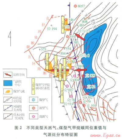 佳木河組干酪根碳同位素值很重,581井、514井和594井9個樣品干酪根的碳同位素值為-21.96‰~-20.29‰,有機質(zhì)類型以腐殖型干酪根為主。這套烴源巖成熟度較高,鏡質(zhì)體反射率為1.38%~1.90%,綜合評價為高成熟的較差氣源巖。依據(jù)沉積古地理推測在凹陷中泥巖的有機碳含量應(yīng)該更高。因此,佳木河組應(yīng)該是一套(且是研究區(qū)內(nèi)唯一一套)具有一定有機質(zhì)豐度、演化程度較高、具有生氣能力的烴源巖。加之煤型氣與其碳同位素值相近,并且同一來源天然氣的順層運移會造成碳同位素分餾,以煤型氣為主的天然氣甲烷碳同位素值在該區(qū)區(qū)域性斜坡的背景上,呈現(xiàn)出自佳木河組氣源中心向氣藏方向逐漸變輕的趨勢(圖2),指示了天然氣白東向西的運移方向。油型氣來源已有大量研究[12],皆表明其與原油同源,主要來自于風(fēng)城組烴源巖。