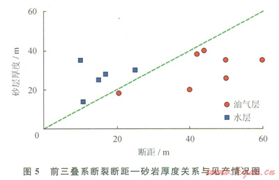 斷層是形成二疊系圈閉的重要封閉條件,克百地區(qū)斷層遮擋具有以下特征:①斷層較為古老,二疊紀(jì)后未活動,剖面上表現(xiàn)為未錯斷上烏爾禾組蓋層;②延伸較長,斷距較大的斷層控制了主要油氣藏的形成;③呈弧形彎鹽的斷層易形成有效的圈閉和油氣藏。統(tǒng)計結(jié)果表明(圖5),當(dāng)前三疊系斷層斷距大于單砂層厚度時[19],利于形成上傾方向遮擋,如581井北斷裂、56l井北斷裂、克007井北斷裂、克80井西斷裂等,而當(dāng)斷層斷距小于單砂層厚度時,不利于形成上傾方向遮擋。