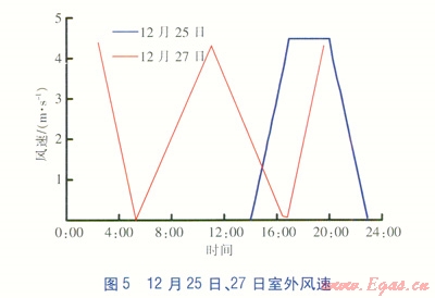 12月25日、27日逐時室外溫度、風(fēng)速分別見圖4、5。由圖4、5可知,測試日室外溫度變化趨勢基本一致。最高室外溫度均出現(xiàn)在16:40左右,25日、27日最高室外溫度分別為5.9、6.6℃。日最低室外溫度基本出現(xiàn)在8:00前后,25日、27日最低室外溫度分別為-9.07、-8.03℃。25日14:O0之后開始起風(fēng),風(fēng)速在16:00左右升至4.5m/s;27日全天風(fēng)速變化范圍0~4.5m/s。由實測結(jié)果可知,25日、27日室外空氣相對濕度變化范圍分別為6.04%~24.26%、5.52%~19.38%。
