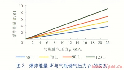 從圖1中可以看出,Kinney公式計(jì)算出的數(shù)值最大,而Baker公式計(jì)算出的數(shù)值最小,Broad公式居中,因此,一般采用Broad公式計(jì)算,本文也采用Broad公式的計(jì)算結(jié)果做進(jìn)一步的危害分析。根據(jù)公式(3),繪制出爆炸前氣瓶容積V1分別取50、70、90、120L時(shí),爆炸能量形與氣瓶?jī)?chǔ)氣壓力p1的關(guān)系,見(jiàn)圖2。