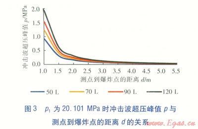 當(dāng)Z≥1時(shí),公式的精確度較高;當(dāng)Z<1時(shí),測(cè)點(diǎn)距爆炸點(diǎn)較近,因受到爆炸產(chǎn)物的影響,使得數(shù)據(jù)有一定的偏差。根據(jù)公式(5)~(7),繪制出當(dāng)爆炸前氣瓶?jī)?chǔ)氣壓力p1為20.101MPa時(shí),氣瓶容積V1分別為50、70、90、120L的4種常用氣瓶,爆炸產(chǎn)生的沖擊波超壓峰值p與測(cè)點(diǎn)到爆炸點(diǎn)的距離d的關(guān)系曲線,見(jiàn)圖3。