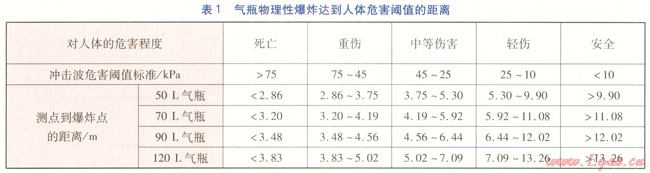 全球領(lǐng)先的專(zhuān)業(yè)風(fēng)險(xiǎn)管理服務(wù)機(jī)構(gòu)挪威船級(jí)社(DNV)在SAFETI軟件的定量風(fēng)險(xiǎn)評(píng)價(jià)中,根據(jù)沖擊波對(duì)人體的損傷程度,按沖擊波超壓峰值的大小,將爆炸產(chǎn)生沖擊波的危害程度分為死亡、重傷、中等傷害、輕傷、安全5個(gè)區(qū)域,并給出了各個(gè)區(qū)域?qū)?yīng)的爆炸沖擊波危害閾值標(biāo)準(zhǔn)[8]。根據(jù)該閾值,本文采用MATLAB編制計(jì)算程序[9],計(jì)算出4種常見(jiàn)規(guī)格的氣瓶在20MPa的情況下破裂發(fā)生物理性爆炸達(dá)到人體危害閾值的距離,見(jiàn)表1。