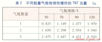 另外,部分CNG汽車(chē)會(huì)將幾個(gè)氣瓶放在一起,且放置距離較近。當(dāng)一個(gè)氣瓶發(fā)生爆炸時(shí),可能會(huì)引發(fā)周?chē)钠渌麣馄勘?,從而?dǎo)致爆炸能量成倍增加。表2為不同數(shù)量的4種常用氣瓶在20MPa的情況下破裂后發(fā)生物理性爆炸的TNT當(dāng)量。