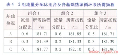 根據(jù)各基礎(chǔ)熱源設(shè)計(jì)質(zhì)量流量,經(jīng)計(jì)算可得,基礎(chǔ)熱源A~C的流量分配比限額(最大值)分別為0.6、0.3、0.2。在南線出口事故工況下,按照10%步長改變各基礎(chǔ)熱源流量分配比,可得到3組流量分配比組合。按照文獻(xiàn)[8]的計(jì)算方法,分別計(jì)算3組流量分配比組合中各基礎(chǔ)熱源循環(huán)泵所需揚(yáng)程。3組流量分配比組合及各基礎(chǔ)熱源循環(huán)泵所需揚(yáng)程見表4。