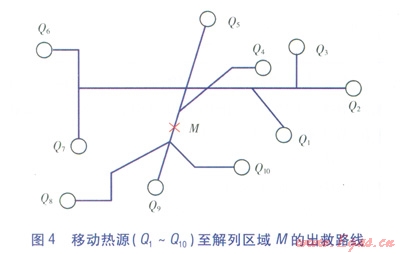 移動(dòng)熱源(Q1~Q10)至解列區(qū)域M的出救路線見圖4。各移動(dòng)熱源達(dá)到解列區(qū)域的時(shí)間及供熱能力見表5。設(shè)解列區(qū)域的最低限額供熱量為50kW,考慮移動(dòng)熱源到達(dá)解列區(qū)域時(shí)間以及式(2),得到出救移動(dòng)熱源順序?yàn)?/span>Q10、Q5、Q9、Q4,即解列區(qū)域恢復(fù)供熱的最短時(shí)間為8min。考慮移動(dòng)熱源供熱能力后,最優(yōu)出救移動(dòng)熱源順序?yàn)?/span>Q5、Q9、Q4,此時(shí)解列區(qū)域恢復(fù)供熱的最短時(shí)間仍為8min。由算例可知,通過優(yōu)化在出救時(shí)間最短標(biāo)準(zhǔn)不變的條件下,出救移動(dòng)熱源數(shù)量減少,從而提高了移動(dòng)熱源出救的經(jīng)濟(jì)性。