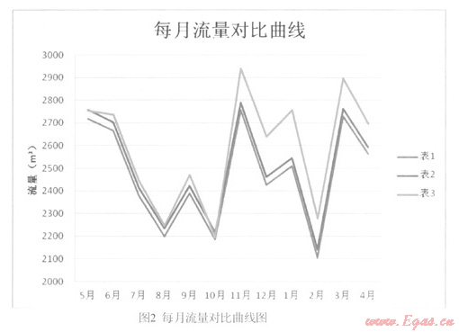 (3)考慮到10月國(guó)慶長(zhǎng)假、2月春節(jié)長(zhǎng)假因素,造成其單月用氣量下降。排除此因素,全年最低用氣量出現(xiàn)在8月,而8月恰好是全年平均氣溫最高的月份。而從整個(gè)曲線來(lái)看,冬季用氣量明顯上升,夏季用氣黽明顯下降,這與實(shí)際情況非常吻合。說(shuō)明溫度對(duì)于用氣量有顯著影響。同時(shí)從整個(gè)曲線來(lái)看,冬季皮膜表的曲線大幅低于標(biāo)準(zhǔn)表(超聲波),夏季則非常接近,說(shuō)明溫度是影響膜式表誤差的重要因素。