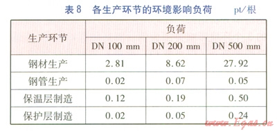 由表7可知,固體廢棄物對環(huán)境影響的貢獻最大,其次分別是懸浮顆粒物、酸化、全球變暖、資源耗節(jié)中鋼材生產(chǎn)的環(huán)境影響最大,其次是保溫層,最后是保護層和鋼管生產(chǎn)。主要原因是鋼材生命周期過程中礦石的開采和鋼鐵冶煉都會產(chǎn)生大量的固體廢棄物,這就造成固體廢棄物對環(huán)境影響比較大。在計算生產(chǎn)環(huán)節(jié)環(huán)境影響時,鋼材生產(chǎn)產(chǎn)生大量廢棄物,同時在此環(huán)節(jié)中,資源耗竭所占比重也比較大,因此鋼材生產(chǎn)就成為保溫管道生產(chǎn)階段環(huán)境影響最大的環(huán)節(jié)。公稱管徑100~500mm鋼材生產(chǎn)形成的環(huán)境影響負荷分別為2.81、8.62、27.92 pt/根。