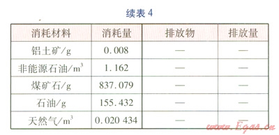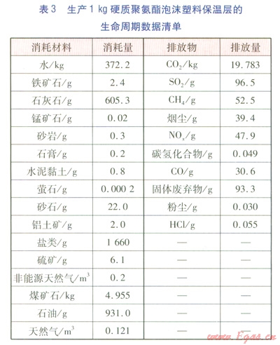 建材的含能(Embodied Energy)近年來在國外得到廣泛研究,含能是指產(chǎn)品從自然界原始材料的掘取,經(jīng)過運輸、加工、組裝直至成品出廠前的所有相關(guān)過程的能耗總和,是基于生命周期的能耗統(tǒng)計數(shù)據(jù)。顧道金[14]利用國外含能數(shù)據(jù),建立了中國建筑產(chǎn)品外推含能數(shù)據(jù)表,并計算了我國能源使用背景下lMJ含能的生命周期數(shù)據(jù)清單。對于保溫層、外護管,在計算環(huán)境影響時都采用此種方法,生產(chǎn)1kg硬質(zhì)聚氨酯泡沫塑料保溫層、高密度聚乙烯外護管的生命周期數(shù)據(jù)清單(關(guān)鍵數(shù)據(jù))分別見表3、4。