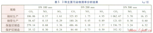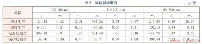 這里僅列出3種主要污染物(CO2、NOx、SO2)的清單分析結(jié)果。在環(huán)境影響方面以我國最受關(guān)注的3個環(huán)境影響類型為例計算環(huán)境影響潛值:全球變暖潛值m1(以當量CO2度量)、富營養(yǎng)化潛值m2(以當量NO3-度量)、酸化潛值m3(以當量SO2度量)。在計算同一種環(huán)境影響潛值時,各種污染物都按照其當量因子折算成統(tǒng)一指標,折算系數(shù)見文獻[14]。生產(chǎn)l根保溫管道的3種主要污染物清單分析結(jié)果及環(huán)境影響潛值分別見表5、6。
