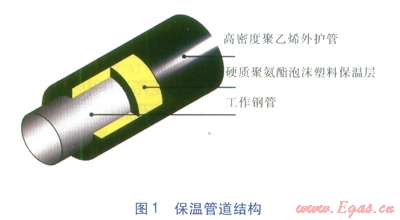 評價對象是以硬質(zhì)聚氨酯泡沫塑料作為保溫層,高密度聚乙烯作為外護管的保溫管道,具體結(jié)構(gòu)見圖1。選取規(guī)格為DN 100、200、500mm保溫管道進行評價,工作鋼管長度均為12m。保溫管道各種技術(shù)參數(shù)執(zhí)行CJ/T 114—2000《高密度聚乙烯外護管聚氨酯泡沫塑料預制直埋保溫管》,3種規(guī)格保溫管道的具體技術(shù)參數(shù)見表1。