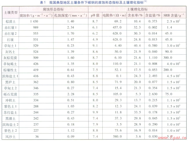 埋地鋼質(zhì)燃氣管道的腐蝕形態(tài)分為全面腐蝕、局部腐蝕兩類,全面腐蝕是指與土壤相接觸的管道表面均因腐蝕而受到損耗,以腐蝕率表示;局部腐蝕是指腐蝕的發(fā)生局限在結構特定區(qū)域或部位上,以孔蝕深度進行評價。本文給出的我國典型地區(qū)土壤對碳鋼的腐蝕形態(tài)指標及土壤理化指標,來自埋沒于國內(nèi)20個典型地區(qū)土壤的碳鋼試驗件1a的腐蝕數(shù)據(jù)及土壤理化性質(zhì),實測數(shù)據(jù)與實際情況接近。