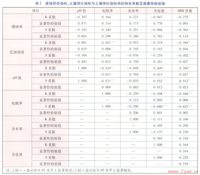 依據(jù)表1中20組樣本數(shù)據(jù),計算得出腐蝕形態(tài)指標與土壤理化指標間的相關系數(shù),所得相關系數(shù)絕對值越大,相關性越強,當求得的相關系數(shù)絕對值大于相關系數(shù)雙側檢驗臨界值時,變量間顯著相關(相關系數(shù)為正,變量顯著正相關;相關系數(shù)為負,變量顯著負相關),否則不相關。