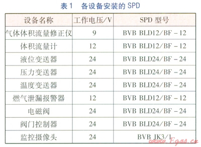 ①利用SPD將設(shè)備各端口的對(duì)地電位限制在設(shè)備能承受的范圍內(nèi),同時(shí)將各端口的感應(yīng)過(guò)電壓、過(guò)電流泄放到地,實(shí)現(xiàn)對(duì)設(shè)備的保護(hù)。安裝在室外的設(shè)備在各進(jìn)出線(xiàn)端安裝SPD,SPD需安裝于防水防爆屏蔽箱內(nèi)。該措施解決了上述隱患①~⑥。具體各設(shè)備安裝的SPD見(jiàn)表1。