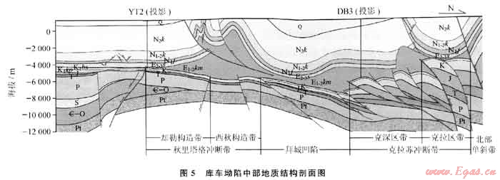 克深區(qū)帶是克拉蘇構造帶的又一個次級構造單元,呈NEE向條帶狀展布,東西長約190km,南北最寬約17km。北側以克拉蘇斷裂為邊界,位于克拉區(qū)帶的下盤;南側以拜城斷裂為界,與拜城凹陷相接。拜城斷裂是克拉蘇構造帶的南邊界斷裂,規(guī)模、性質(zhì)、斷開層位與克拉蘇斷裂相同。與克拉蘇斷裂相比,拜城斷裂斷距變小,最大垂直斷距約為2000m,斷面較緩,該斷裂控制克深區(qū)帶的南邊界??松顓^(qū)帶還發(fā)育多條與克拉蘇斷裂、拜城斷裂近于平行的次級斷裂,斷裂性質(zhì)與兩邊界斷裂相似,規(guī)模相對較小,多條次級斷裂與2條邊界斷裂共同決定了克深區(qū)帶的構造樣式(圖4、5)。