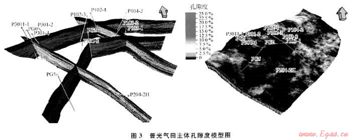 普光地區(qū)儲(chǔ)層屬于碳酸鹽巖礁灘相沉積,針對(duì)儲(chǔ)層儲(chǔ)集空間的類型多樣,儲(chǔ)層厚度大、非均質(zhì)性較強(qiáng),存在多套氣水關(guān)系等地質(zhì)特點(diǎn),綜合利用地震、測(cè)井及地質(zhì)等資料,在對(duì)儲(chǔ)層主控因素分析的基礎(chǔ)上,根據(jù)確定性建模與隨機(jī)建模相結(jié)合的原則、等時(shí)建模原則、地震數(shù)據(jù)約束建模原則,利用序貫高斯模擬法、克里金模擬法,對(duì)儲(chǔ)層物性空間分布的非均質(zhì)性進(jìn)行了細(xì)致的描述,建立普光氣田主體構(gòu)造儲(chǔ)層模型。