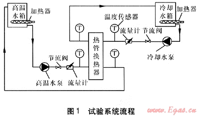 液-液熱管換熱器的試驗(yàn)裝置包括高溫水系統(tǒng)、冷卻水系統(tǒng)、數(shù)據(jù)采集系統(tǒng)。高溫水系統(tǒng)包括高溫水箱、可調(diào)功率加熱器、高溫水泵、流量調(diào)節(jié)裝置(節(jié)流閥)。冷卻水系統(tǒng)包括冷卻水箱、可調(diào)功率加熱器、冷卻水泵、流量調(diào)節(jié)裝置(節(jié)流閥)。數(shù)據(jù)采集系統(tǒng)主要包括轉(zhuǎn)子流量計(jì)、溫度傳感器。熱管換熱器的外殼為開(kāi)式,可更換熱管,外殼覆蓋絕熱層,減少熱損耗,提高試驗(yàn)精度。試驗(yàn)系統(tǒng)流程見(jiàn)圖1。