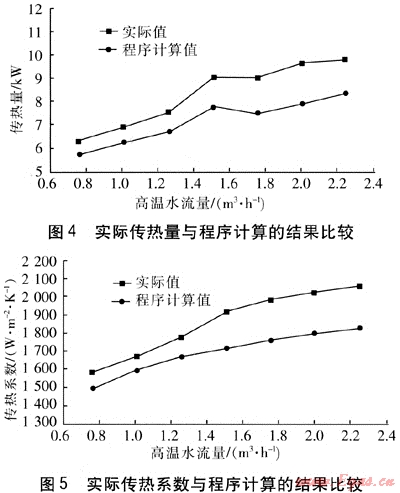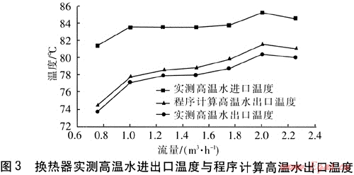 換熱器高溫水進(jìn)出口溫度與程序計(jì)算高溫水出口溫度見(jiàn)圖3。由圖3可知,當(dāng)高溫水流量在0.75~2.25m3/h變化時(shí),實(shí)測(cè)的高溫水出口溫度與程序計(jì)算值的變化趨勢(shì)基本是一致的,但實(shí)測(cè)值比程序計(jì)算值低,即換熱器的實(shí)際傳熱量比程序計(jì)算的高。