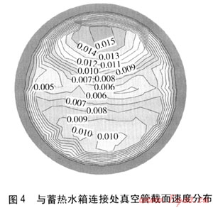 真空管(長度為1800mm)與蓄熱水箱連接處以及距蓄熱水箱450、900、1350mm處的真空管截面速度分布分別見圖4~7,圖中數值單位均為m/s。由圖4~7可知,沿著遠離蓄熱水箱方向,真空管內冷熱流體的速度先增大后減小,在距蓄熱水箱450mm處速度最大。說明在距蓄熱水箱450mm這段真空管內存在冷熱流體的回流混合,造成熱損失,降低了集熱系統(tǒng)的效率,采用引流擋板可以在一定程度上解決該問題[11]。