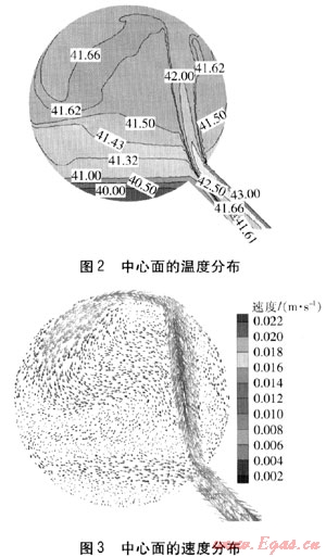 中心面的溫度、速度分布分別見圖2、3,圖2中數值單位為℃。