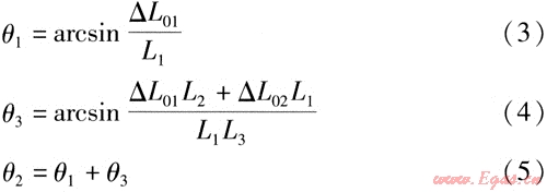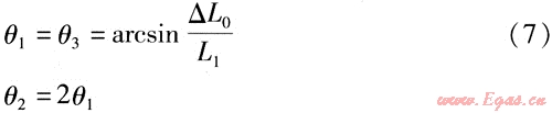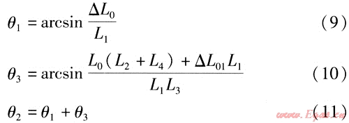 鉸鏈波紋管補(bǔ)償器吸收管道熱位移后,通過(guò)2個(gè)或3個(gè)補(bǔ)償器組成的補(bǔ)償系統(tǒng)角度的變化補(bǔ)償管段的熱位移。運(yùn)用理論力學(xué)對(duì)鉸鏈波紋管補(bǔ)償器變形簡(jiǎn)化模型進(jìn)行分析,得到幾種典型布置形式及吸收熱位移后的角位移計(jì)算式。在各典型管系的管道布置形式中:S1~S3為鉸鏈波紋管補(bǔ)償器編號(hào);L0、L01、L02、L1、L2、L3、L4為對(duì)應(yīng)管段長(zhǎng)度,單位為m;△L0、△L01、△L02為長(zhǎng)度為L(zhǎng)0、L01、L02管段的熱位移,單位為m。熱位移計(jì)算式為: