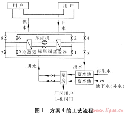 水源熱泵通過輸入少量電能,把不能直接利用的低位能量轉(zhuǎn)化成可利用的高位能量,實(shí)現(xiàn)節(jié)能。由于水源熱泵需要合適的水源,因此在應(yīng)用上受到一定限制,造價(jià)及節(jié)能程度也有所不同。一般情況下,若允許抽取地下水,則采用打井的辦法取水及回灌,有江河湖水的地方采用水源熱泵也是不錯(cuò)的選擇。但有時(shí)某些場(chǎng)所不具備水源條件,或由于冬季水溫較低,影響熱泵運(yùn)行。供水中心采用水源熱泵恰好克服了以上不足:①有供廠區(qū)的再生水和補(bǔ)充水(地下水),可直接從中取用一部分,不需打井取水。②熱泵出水直接排入供水中心的蓄水池,不用打井回灌。③再生水溫在20℃以上,冬季用于熱泵供熱;當(dāng)夏季需制冷時(shí),采用補(bǔ)充水(地下水)作為水源,水溫常年保持在12~13℃,有利提高熱泵效率。④熱泵與用戶同處一地,管道造價(jià)很低。因此,我們決定采用方案4。