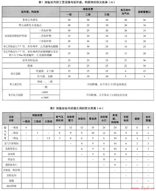 加氫站是甲類火災(zāi)危險眭設(shè)施,必須在設(shè)計上保證其安全可靠。在加氫站進行站址選擇和站內(nèi)建、構(gòu)筑物及設(shè)備平面布局設(shè)計時,必須符合上海市城市規(guī)劃和站區(qū)防火安全的要求,參照上海市地方規(guī)范《燃料電池汽車加氫站技術(shù)規(guī)程》,確保加氫站與站外重要公共建筑物、明火或散發(fā)火花地點、民用建筑和廠房、庫房、儲罐、鐵道、鐵路、架空通信線、架空電力線路等保持足夠的防火距離滿足表1的要求。