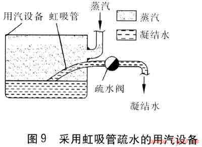 采用虹吸管疏水時(見圖9),用汽設(shè)備中的凝結(jié)水由蒸汽推動進(jìn)入疏水管道,因此凝結(jié)水易與蒸汽一同進(jìn)入疏水閥,導(dǎo)致蒸汽鎖的產(chǎn)生。這時可通過使用蒸汽鎖釋放閥來釋放部分蒸汽,確?;煊姓羝哪Y(jié)水能夠無阻礙地連續(xù)流入疏水閥[7~8]。