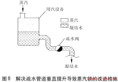 若疏水管道垂直提升,蒸汽則先進(jìn)入疏水閥,進(jìn)而發(fā)生蒸汽鎖[6],見圖7。解決這種蒸汽鎖的方法是改變疏水管道的結(jié)構(gòu),見圖8。使得凝結(jié)水可以依靠重力自然流動,不易發(fā)生蒸汽鎖。