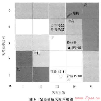 2) 注采氣站風(fēng)險(xiǎn)評(píng)估結(jié)果表明:壓縮機(jī)系統(tǒng)和處理系統(tǒng)風(fēng)險(xiǎn)遠(yuǎn)遠(yuǎn)大于管路系統(tǒng)風(fēng)險(xiǎn),其中壓縮機(jī)組最大;處理系統(tǒng)設(shè)備中空冷器風(fēng)險(xiǎn)最大,其次是緩沖罐(壓縮機(jī)出口)、過(guò)濾分離器和旋流分離器(圖5);而管路系統(tǒng)中對(duì)帶壓的34條管線中,從壓縮機(jī)出口到緩沖罐出口的管線P2112~P2118風(fēng)險(xiǎn)最大,其中P2113最大,管路系統(tǒng)風(fēng)險(xiǎn)值大主要是由于壓力和溫度相對(duì)較高引起的。采用風(fēng)險(xiǎn)矩陣對(duì)各類(lèi)設(shè)備或管路風(fēng)險(xiǎn)定級(jí)可知:壓縮機(jī)風(fēng)險(xiǎn)為高風(fēng)險(xiǎn),而管路系統(tǒng)均為中低風(fēng)險(xiǎn)(圖6)。通過(guò)風(fēng)險(xiǎn)排序,明確了高風(fēng)險(xiǎn)單元,即可采用HAZOP法進(jìn)行詳細(xì)風(fēng)險(xiǎn)分析。