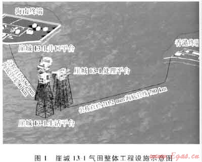 崖城13-1氣田大部分天然氣經(jīng)脫水和烴露點(diǎn)處理后,經(jīng)一條公稱直徑711.2mm長780km的海底管線輸送到香港特別行政區(qū)用于發(fā)電,小部分天然氣和全部凝析油經(jīng)一條公稱直徑356mm長90km的海底管線送往海南省南山終端處理和銷售。
