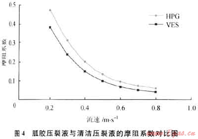 這種新型的溶液的結(jié)構(gòu)具有良好的可逆性,當(dāng)高剪切時,結(jié)構(gòu)解體;剪切速率降低后,結(jié)構(gòu)又重新恢復(fù)。采用自研環(huán)路實(shí)驗(yàn)裝置測定的流動摩阻如圖4所示:在同等條件下VES壓裂液摩阻系數(shù)比胍膠壓裂液低,有利于降低施工摩阻減小施工壓力。