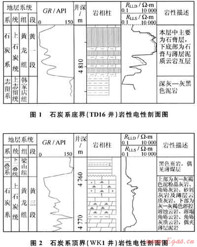 志留系與石炭系在巖性及電測曲線上均易于劃分。其上下地層的巖性和電性差異較為明顯。從巖性上看,C2hl底部以石膏夾薄層泥質云巖互層,韓家店組深灰-灰黑色泥巖為主。從電性上看,C2hl對應的測井曲線反映為較低GR值、較高RLLD和RLLS值,與下伏志留系地層區(qū)別明顯(圖1)。