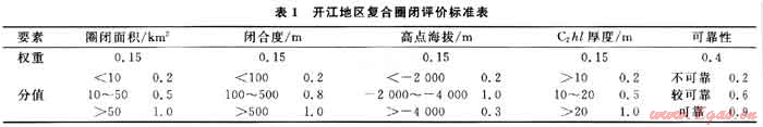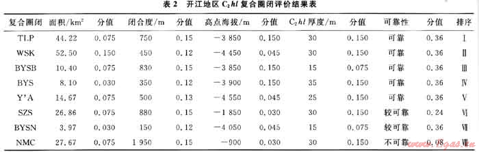 C2hl及其上、下巖層的組合是四川盆地多套生、儲蓋組合中較好的一套組合,經(jīng)過多年的勘探也證實C2hl具有豐富的天然氣資源。結合已發(fā)現(xiàn)C2hl氣藏特征對已識別C2hl復合圈閉面積進行劃分,圈閉面積小于10km2的權值取0.2,圈閉面積大于50km2的取權值1.0,圈閉面積介于10~50km2的取權值0.5,圈閉面積評價系數(shù)權重為O.15(表1)。