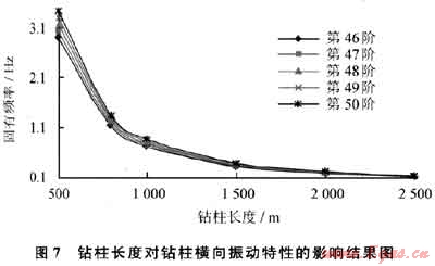 取固有頻率階數(shù)為第46~50時的固有頻率值比較,鉆柱長度對振動的影響計算結果如圖7所示。鉆柱長度增加,其橫向振動固有頻率明顯降低。鉆柱長度的變化對直井整體鉆柱橫向振動特性影響非常明顯。根據(jù)計算結果,把固有頻率轉換成轉速,整體鉆柱長度為500m時,其對應轉速在轉盤轉速60~70r/min的固有頻率有3階;鉆柱長度為800m時,有5階;鉆柱長度為1000m時,有7階;鉆柱長度為1500m時,有13階;鉆柱長度為2000m時,達16階;鉆柱長度為2500m時,共有20階之多。