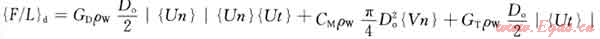 式中{F/L}d表示由于液體動力效應引起的單位長度上的載荷;CD表示法向阻力系數(shù);ρw表示外部液體的密度;Do表示管柱實際外徑;{Un}表示法向相對速度矢量;CM表示慣性系數(shù);{Vn}表示法向加速度矢量;CT表示切向阻力系數(shù);{Ut}表示切向上相對速度矢量。