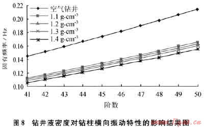 由于鉆井液的存在,鉆柱在進行軸向運動的時候,受到鉆井液的黏滯作用。根據(jù)鉆井液的流變特性,其密度越高,黏度越大,對鉆柱軸向運動的阻礙作用越明顯??梢?,鉆井液會對鉆柱縱向振動的固有頻率產(chǎn)生很大影響,改變縱向振動的臨界轉速,這種影響必須引起足夠的重視。