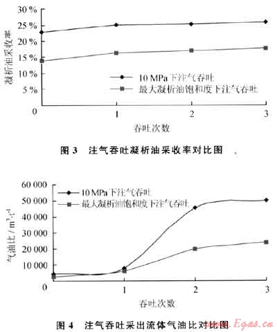 兩種實(shí)驗(yàn)結(jié)果表明凝析油采收率均不高。前者吞吐3次后,凝析油采收率為17.60%,而后者吞吐3次可得凝析油采收率25.61%,這是由于壓力增加蒸發(fā)部分析出凝析油,但壓力下降后馬上又析出,沒有建立驅(qū)動(dòng)循環(huán),因此采收率低,說明采用單井吞吐效果不好。
