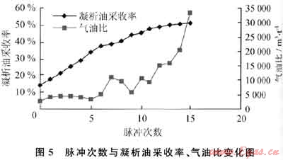 圖5為脈沖次數(shù)與凝析油采收度、氣油比的變化關(guān)系,在31MPa開始進(jìn)行脈沖注氣,雖然脈沖壓力波動(dòng)范圍都是25%,但由于建立了單向流動(dòng)通道,因此采收率相對(duì)較高,脈沖很多次后仍有一定油量采出,在進(jìn)行15次脈沖時(shí),油采出程度51.23%,增加凝析油采收率37.62%。說明在裂縫孔洞型碳酸鹽儲(chǔ)層中,建立注采循環(huán)系統(tǒng)后,有壓力脈沖可使部分凝析液得到反蒸發(fā),從而比最大凝析油飽和度下注氣凝析油采收率提高了4%左右。