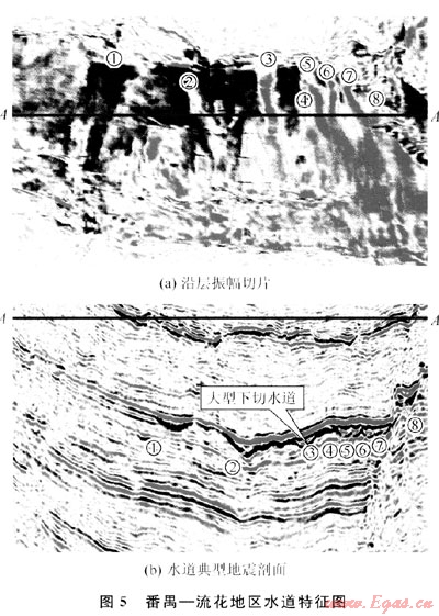 該區(qū)目前無鉆井鉆遇到該地質體,但在該區(qū)東部,其水下水道的地震特征非常明顯:利用最新采集的3D地震資料,以精細的3D地震資料做基礎,能夠清晰地觀察到水道的侵蝕、平面分布等特征。通過分析,發(fā)現了8條水道(圖5中①~⑧),自西向東依次排列,由北向南延伸,隨著坡度的逐漸減緩,在河道下方分別演化為扇狀朵體,并相互疊置(圖5-a)。這些水道在不同位置,其形態(tài)、寬度、長度都不同,但具有相似的地震相特征:地震同相軸呈點、段式反射,下切特征明顯,振幅中等-高(圖5-b)。通過這些水道下切形態(tài)、深度、地震反射特征和沉積厚度,可推測其形成于同一時期,且物源均來自于正北方向。