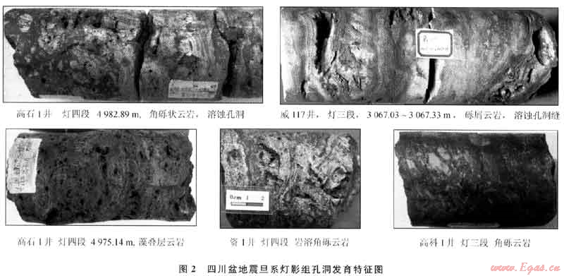 震旦系燈影組下部(燈二段)也有儲(chǔ)層發(fā)育。由于其埋藏較深、含水層較多,以前并未給予足夠重視,對(duì)其取得的實(shí)物資料較少,研究程度不高。從目前不多的資料來看,它和上部的儲(chǔ)層發(fā)育特征有所差異,主要表現(xiàn)為溶洞規(guī)模降低,孔隙層增多。巖心描述顯示:燈影組向下大型縫洞減少,小型孔洞占據(jù)優(yōu)勢(shì),高科1井燈影組巖心統(tǒng)計(jì),溶洞巖心累計(jì)28.57m,其中燈四段11.45m(占40.1%),燈三段12.20m(占42.7%),燈二段4.92m(占17.2%),顯示出向下溶洞發(fā)育減弱。但是在基質(zhì)物性方面,下部?jī)?chǔ)層有變優(yōu)的趨勢(shì),表明孔隙層增多,借此可以彌補(bǔ)溶洞層減少的不足。