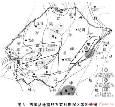 研究表明,震旦系沉積、儲(chǔ)層及油氣演化與富集均受地史時(shí)期構(gòu)造運(yùn)動(dòng)的影響,主要包括桐灣期、加里東期、印支期、喜山期4期構(gòu)造運(yùn)動(dòng),其中又以加里東運(yùn)動(dòng)、喜山運(yùn)動(dòng)形成的古隆起、疊隆和現(xiàn)今構(gòu)造意義最為深遠(yuǎn)。通過油氣地質(zhì)條件對(duì)比分析,認(rèn)為四川盆地震旦系可劃分3個(gè)有利勘探區(qū)帶:古隆起核部巖溶風(fēng)化殼勘探區(qū)帶,古隆起翼部構(gòu)造圈閉有利勘探區(qū)帶,川東臺(tái)緣有利勘探區(qū)帶(圖3)。