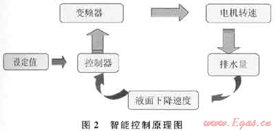 智能控制系統(tǒng)由地面部分和井下部分組成。通過采集井下壓力計或地面流量計信號,根據(jù)煤層氣單井排采規(guī)律,地面人工預先設定井底流壓變化值,由智能控制系統(tǒng)自動閉環(huán)控制排采系統(tǒng)的工作參數(shù)(電機轉速或頻率),實現(xiàn)了井底流壓的智能控制。其控制原理如圖2所示。