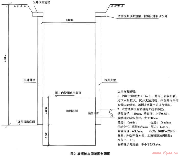 要加固沉井內(nèi)虛土,首先想到的是旋噴樁。眾所周知,旋噴樁是一種適合于加同軟土的很好地基處理方法,但其施工一般是在地面上進(jìn)行。旋噴樁若要在深度達(dá)17m、而其中上部還要架卒約13m的沉井內(nèi)施工卻是從未曾有人嘗試過(guò)。旋噴樁施工隊(duì)伍也擔(dān)心架空13m可能無(wú)法施工、加固效果很難保證。經(jīng)過(guò)仔細(xì)分析,我們大膽提出,只要采取的措施得法,旋噴樁是可以用于加固沉井內(nèi)虛土并起到止水作用的。通過(guò)現(xiàn)場(chǎng)指導(dǎo)施工,落實(shí)各項(xiàng)施工措施,最終證明,旋噴樁加固效果良好,虛土加固后,井底未出現(xiàn)涌砂、涌土現(xiàn)象,順利清除了井底虛土,保證了沉井順利封底。見(jiàn)圖1、圖2。