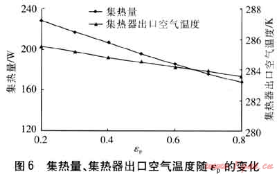 保持其他參數(shù)不變,集熱量、集熱器出口空氣溫度隨εp的變化見圖6。由圖6可知,隨著εp增大,吸熱板對(duì)環(huán)境的輻射傳熱增強(qiáng),熱損失增大,集熱量降低。由于吸熱板溫度降低,與空氣的對(duì)流傳熱減弱,因此集熱器出口空氣溫度降低。集熱量與集熱器出口空氣溫度降低的趨勢(shì)逐漸減緩,這是由于隨著吸熱板溫度的降低,熱損失的增長(zhǎng)率也大大降低。