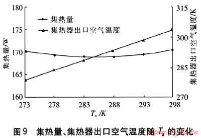 保持其他參數(shù)不變,集熱量、集熱器出口空氣溫度隨Ta的變化見圖9。由圖9可知,Ta增大,即集熱器進(jìn)口空氣溫度增大,則集熱器出口空氣溫度相應(yīng)升高。