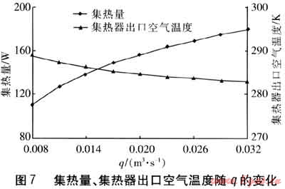 保持其他參數(shù)不變,集熱量、集熱器出口空氣溫度隨q的變化見圖7。由圖7可知,隨著q的增大,集熱器出口空氣溫度降低,這是由于q的增大易導(dǎo)致空氣穿過吸熱板的時(shí)間和在集熱器內(nèi)部流動(dòng)的時(shí)間縮短,影響了換熱效果。然而,集熱量一方面取決于集熱器出口空氣溫度與環(huán)境溫度之差,另一方面取決于q。由圖7可知,當(dāng)q增大時(shí),集熱器出口空氣溫度降低幅度較小,此時(shí)q成為影響集熱量的決定因素。因此隨q的增大,集熱量逐漸升高。但在集熱器出口空氣溫度逐漸減小的影響下,集熱量的增長(zhǎng)速率是逐漸減緩的。