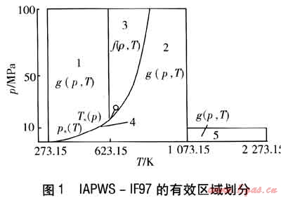 IAPWS-IF97可以計(jì)算的有效區(qū)域由一個(gè)低溫區(qū)域和一個(gè)附加的高溫區(qū)域組成,其中低溫區(qū)域蒸汽溫度(T)和壓力(p)的范圍是273.15K≤T≤1073.15K,p≤100MPa;高溫區(qū)域蒸汽溫度和壓力的范圍是1073.15K≤T≤2273.15K,p≤10MPa。這也是本文推導(dǎo)出的計(jì)算公式所能計(jì)算的有效區(qū)域。本文中所有的壓力均為絕對(duì)壓力。