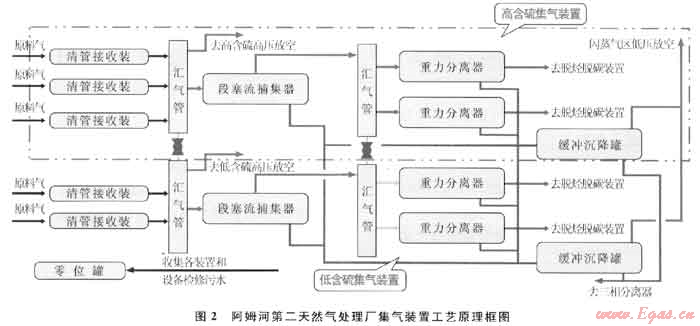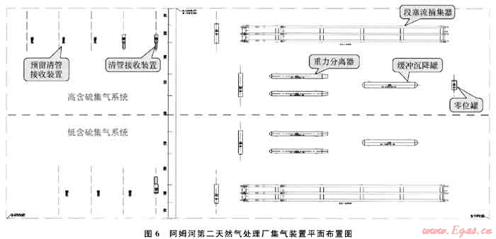 阿姆河第二天然氣處理廠集氣裝置按原料氣中硫化氫含量的高低,設(shè)置了兩套既獨(dú)立又聯(lián)通的天然氣處理系統(tǒng),分別與天然氣處理廠下游的酸氣處理系統(tǒng)對應(yīng),最大限度地滿足土庫曼斯坦當(dāng)?shù)貙Νh(huán)保的要求。