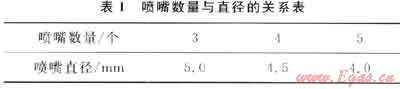 根據(jù)設(shè)定的現(xiàn)場(chǎng)條件,將Q、△p帶入式(5)、(6)中,得出噴嘴數(shù)量與直徑的關(guān)系如表1所示。